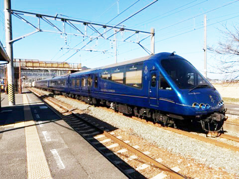 氷見駅から三芳駅へ 予讃線伊予氷見駅12時14分発の松山行きに乗り、伊予三芳駅に12時35分着。三芳駅にはThe Royal Expressと書いた青色の列車が停まっていた。(天皇家のご旅行かと思ったがそうではなく東急の特別観光列車。)