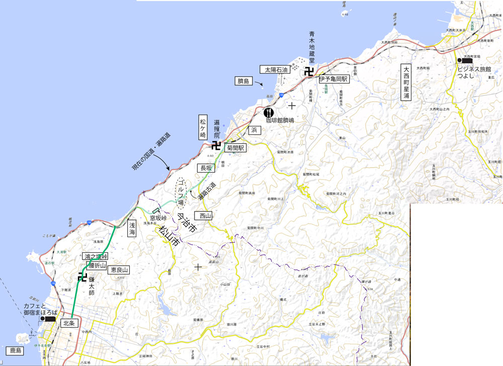 遍路古道 浅海ー菊間を結ぶ山の中の遍路古道についてはネットに詳しい説明があった。今回歩いた道と古道を下の地図にまとめた。ゴルフ場が造成されたため、その部分の古道は残っていないと思われる。 [33,340歩 24.77km]. (ビジネスホテルつよし) [目次へ戻る]