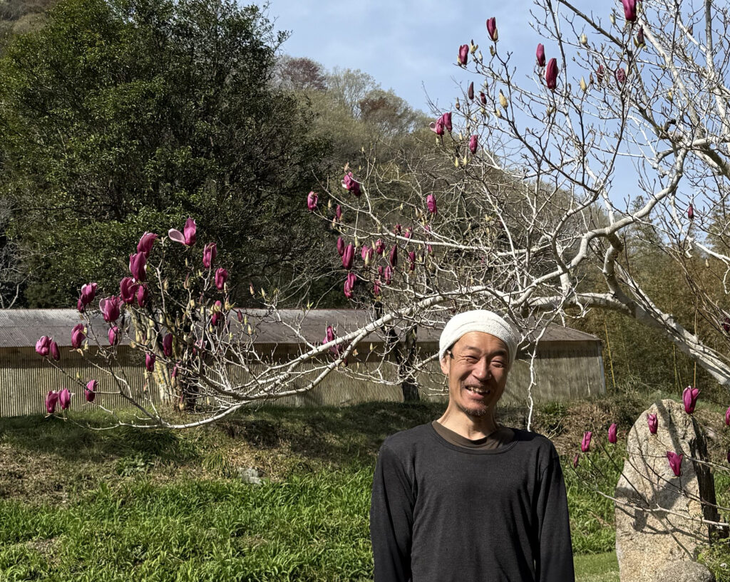 五名の陶芸家 9時、渓流と林の道がパッと開けて山間の小さな盆地に出た。そこに赤紫のモクレンの木があるな、と見上げたところに男性がニコニコと立っている。及川みのるさん。ここで陶芸制作をされているとのことで、人物をテーマとした作品を見学させていただいた。制作作業の他、繁る竹林を切り開くなど毎日多忙であるそう。家と作業場のある谷間も美しい所だ。及川さんの人柄と作品に惹きつけられてもっとお話をしたかったが、今夜の宿のことを思い、先を急ぐ。