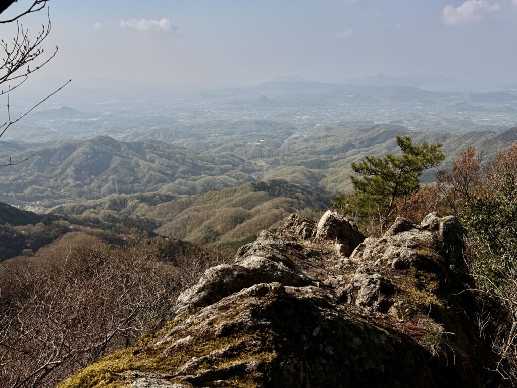 女体山越え 13時20分、自動車道路に出た。太郎兵衛という場所。すぐ先に女体山登山口があり、山頂まで1138mとの表示がある。もう少しだな。最初は階段状の登山道だが、岩登りになる。14時ごろ再び自動車道路に出てすぐ先に登山道がある。急な岩登りが続く。14時40分、平坦なところに出たので頂上に近いと思ったら、さにあらず。さらに急な壁のような岩登りが待っていた。金剛杖の置き場を考えながら、一歩一歩しがみつくように岩を登る。正直怖い。一瞬でも気を緩めたら命にかかわる。15時15分、頂上に到着。そこは狭く岩がゴツゴツとしていて、小さな祠があるだけだ。南方に突き出たところがあり写真を撮った。