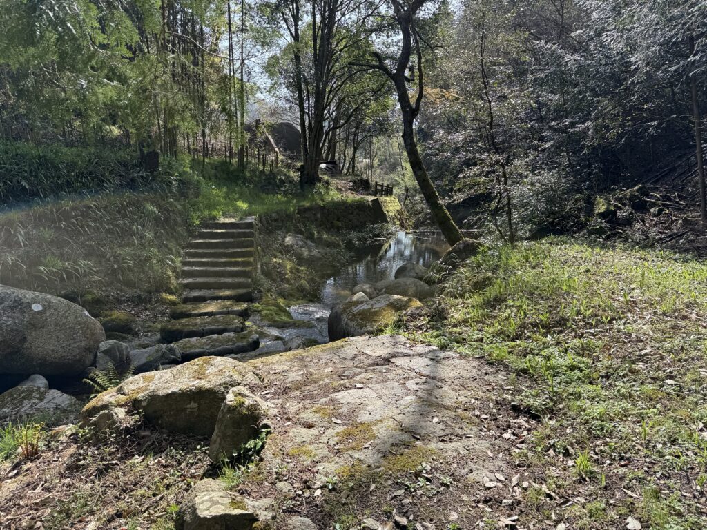 八丁坂 この山道は険しい。急な山道に枯れ草や松ぼっくりが積もっていて歩きづらい。11時20分、峠に石仏とベンチがあり休憩。遍路道を降りていくと自動車道路に出る。境目という地名で、香川県と徳島県の境界である。大きなイチョウの木があり、地元で「いちょうさん」と呼ばれているそうだ。この大木近くを左に折れて名前不明の川沿いの舗装道路を歩いていく。
