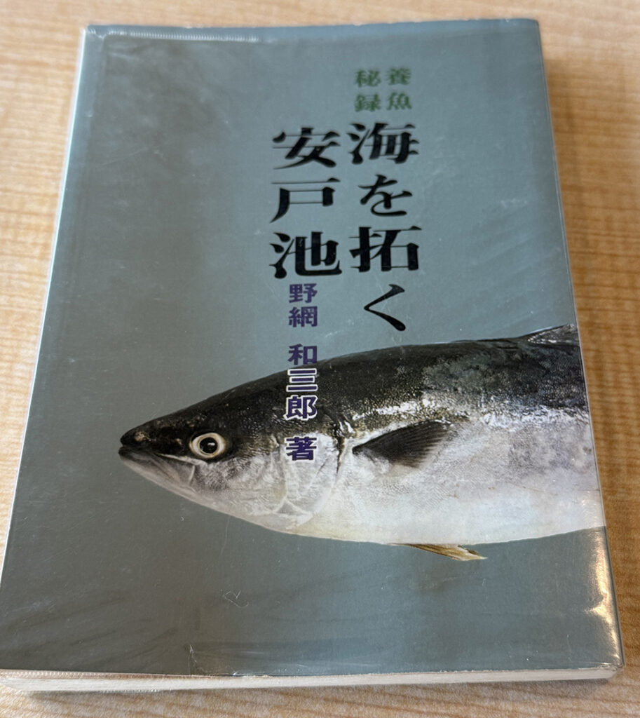 野網家 野網ヒサエの兄、野網和三郎(明治41-昭和44)は、世界で初めて海水魚(ハマチ)の養殖に成功した偉人である。その時の養殖地がこの安戸池。成功した時期は、昭和3年(1928)。和三郎の自叙伝「海を拓く安戸池」(写真下)を読む。和三郎が、父佐吉とともに失敗を重ねながら技術を改良し続けた歴史に頭がさがる。なお、父佐吉が若い時に網を改良したエピソードも面白い。魚が大量に入るように袋網を発明したが、他の漁師からはうまくいくものか、と馬鹿にされた。使ってみると佐吉の予想通り大漁になった。驚いた漁師たちは、佐吉の家に押しかけて改良網を使わないように圧力をかけた・・・という。