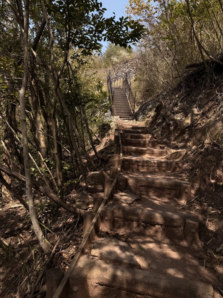 東壁遍路道 一願不動尊の右手の赤い門をくぐると「赤い池」があり、さらに進むとホテル「甚五郎」の醜悪な残骸を見る。そこから東に降りる遍路道が始まっている。屋島台地の東側の壁。これまでの遍路道になかったような険しい道だ。おそらく1000年以上前の遍路でも同じ状態で使われたに違いない。道の途中で立ち止まり、空を仰ぐ。薄緑が輝いて広がっている。およそ1時間かけて険しい道を終えた。ふもとから屋島を見上げると甚五郎の建物とその左のほうに赤い建物が見える。赤い建物は展望台かもしれない。昔も今も、この険しい道を避けて南の道に戻り、山麓を回る遍路も多いだろう。