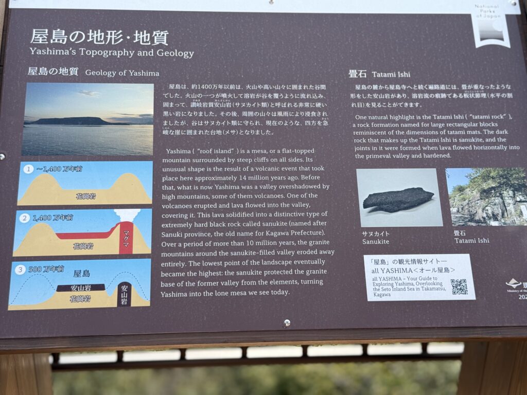 屋島が平らな理由 トレイルには屋島について興味深い説明板がいろいろ掲示されている。その中に屋島が、なぜ平坦な大地となったかを描いた説明が面白い。流れる溶岩がかたち作ったから平らという説明。平らになるほど粘度の低い溶岩が噴き出たんだな。