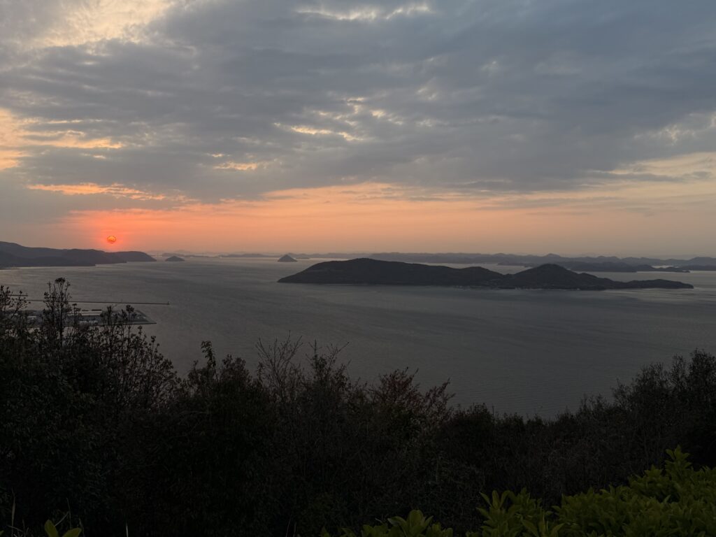望海荘 6時に宿の前で海を眺めながらラジオ体操を実施。このホテルの経営者である込山さんと話をした。込山さんは長くアメリカで情報誌などのビジネスをしており、数年前からここの経営者となった。ホテルは、レストランから瀬戸内の海が眺められる絶好のロケーションだ。私が泊まった部屋は山側で海が見えないので割り安だったが、遍路旅にはもったいない素晴らしい部屋だった。8時、女将に見送られて宿を出発。