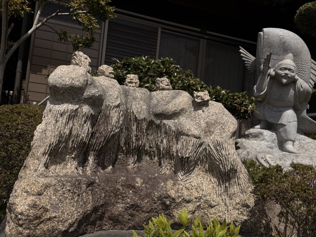 石の加工 屋島から東の海越えに五剣山を見たとき、山肌があちこち削られていて、ここが石材の産地だとわかった。五剣山の麓に来て、ここに立つ説明版によると、庵治石と呼ばれる花崗岩で国会議事堂にも使われている。石像をつくる店もある。大きな鯛を背負った恵比寿様の左に5人が腕を組み合って並んでいるような石像が面白い(写真下)。髭を伸ばし腰巻きをつけ太った裸の像だ。5人で笑いながら歌を歌っているようにも見える。日本人には見えない。バイキングかな?五剣山の5つの峰と関係があるのかな?